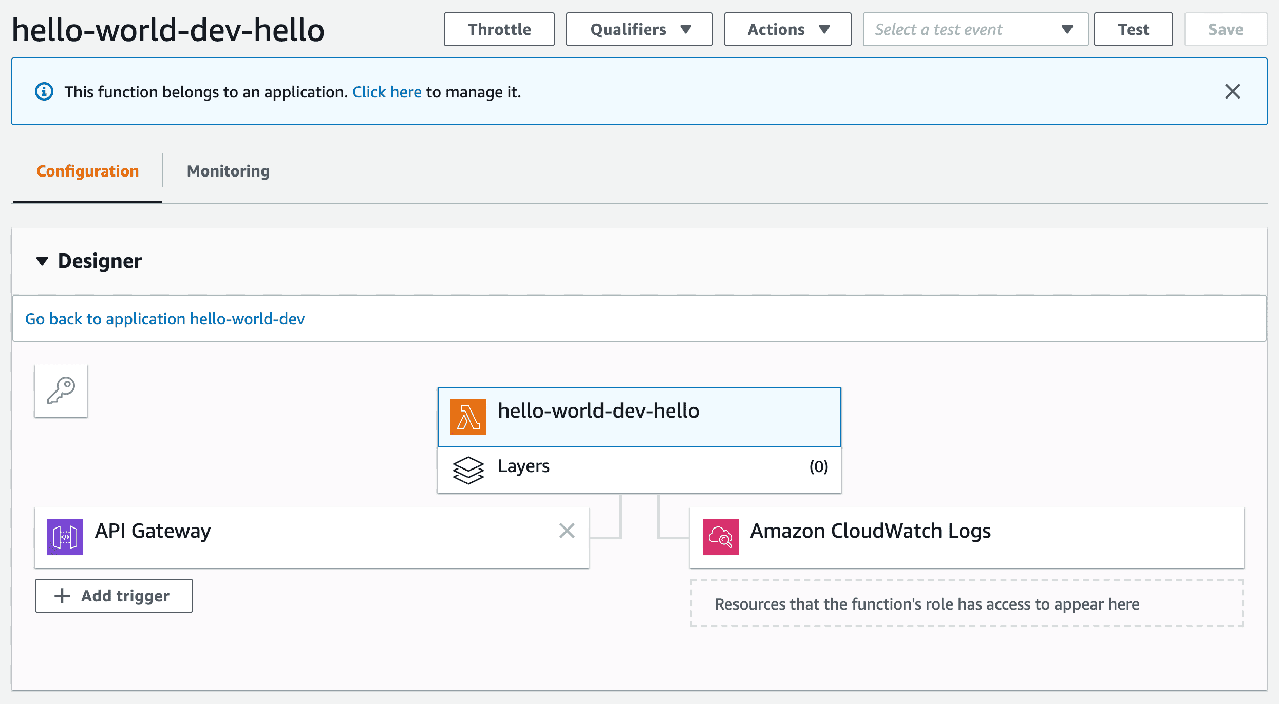 Our service is called hello-world and there's a couple details about our provider. The stage tells the difference between development, QA, and production deployments. More on that in the Dev, QA, and prod chapter.