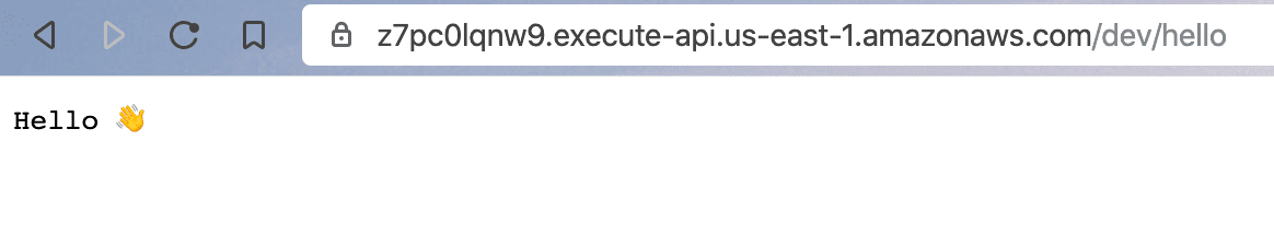 You get a URL for your lambda and some debugging output. My URL is https://z7pc0lqnw9.execute-api.us-east-1.amazonaws.com/dev/hello, if you open it in your browser, it's going to say Hello ๐Ÿ‘‹
